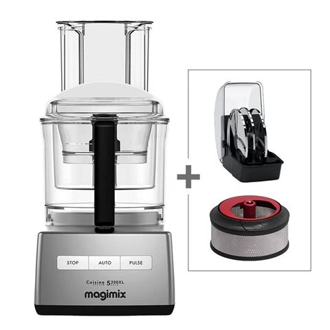 Among its many kitchen feats, the 5200XL can knead two family sized loaves in the main bowl (1.2kg). It also comes with a Juice Extractor and a nifty three blade disc set including a parmesan disc, a 1mm slicer and a 6mm grater. Now your meals will look just as good as they taste.